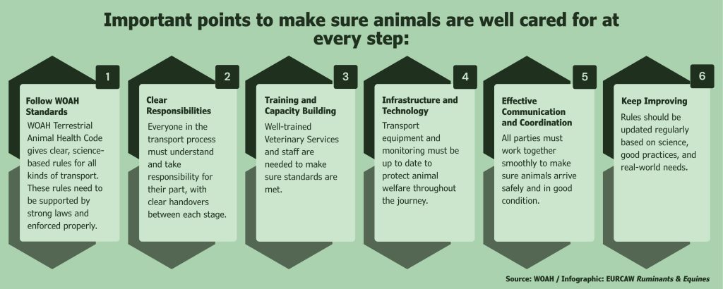 WOAH underscores that long-distance transport can pose serious risks, particularly when complicated by incomplete health certificates, ambiguous customs regulations, commercial disputes, or unforeseen logistical delays. To protect animal welfare, these challenges must be anticipated and carefully managed through comprehensive planning from the outset.
